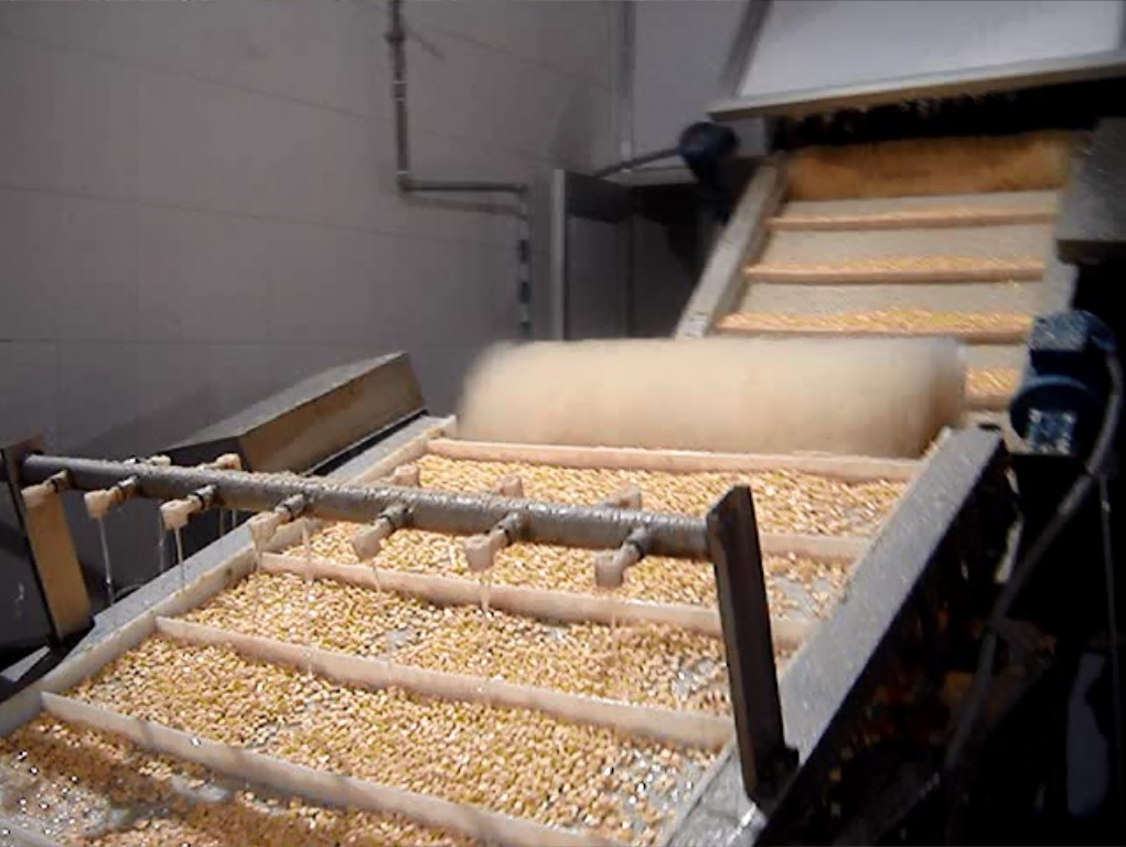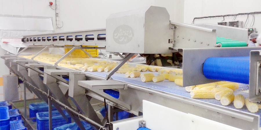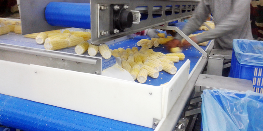 We manufacture processing conveyors for corn according to plant layout. If the customer desires to have peeled corn kernels packed, the labours take the full corn from the main conveyor, inspect them, peel them manually and put in the chute.