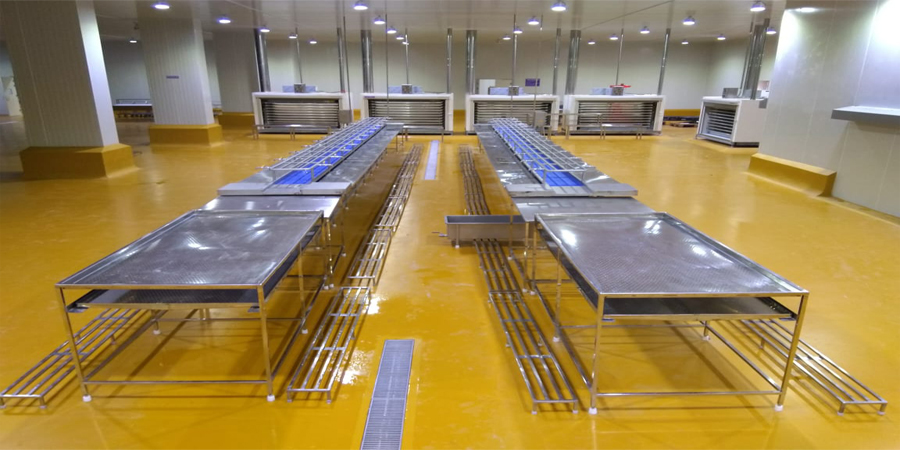 After soaking process, the subsequent process is stacking the right amount of headless materials according to weight. Before stacking process, the headless materials must be inspected in order to deliver the customer with quality material and to avoid rejection of goods. For this purpose, setting conveyor is used. It consists of an Inspection table with perforated sheet at top. The soaked materials are kept on the inspection table. After passing quality check, it is passed to Weighing table. Labors take a quantity of goods and put it in basket for weighing purpose. Once the right weight is displayed, the basket is kept on the setting conveyor.