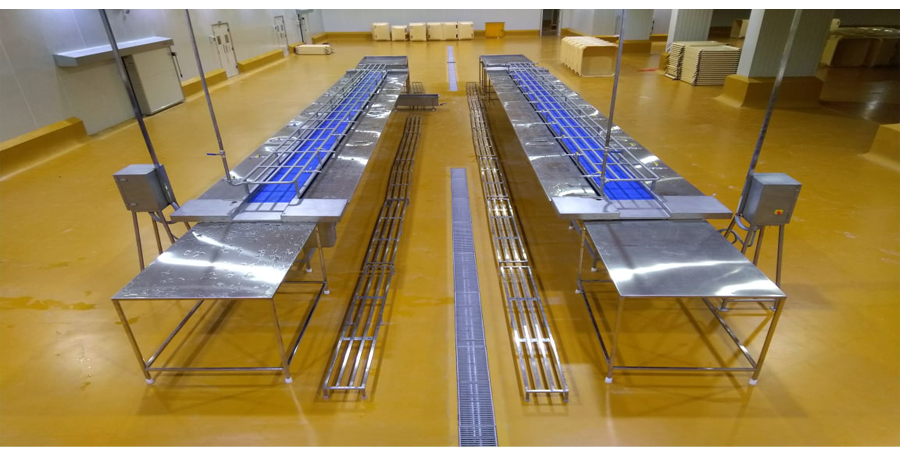 While travelling in the conveyor, labors take this basket and stack the goods inside the freezing pans one by one. Then they keep stacked pan on top conveyor and send the basket to starting point through return side of the belt. The stacked pans are delivered at other side of the conveyor. Labors collect the pans and stack them in plate freezer for further freezer room storage purpose. This conveyor consists of spray line mounted at the top side of the conveyor. This spray line can be used for cleaning purpose.